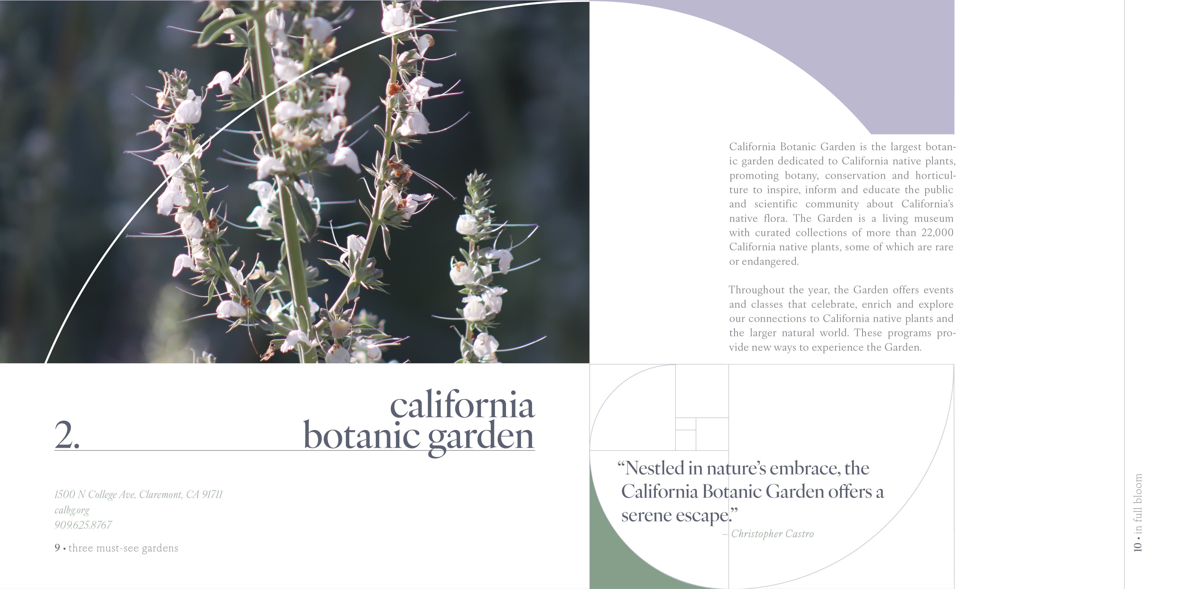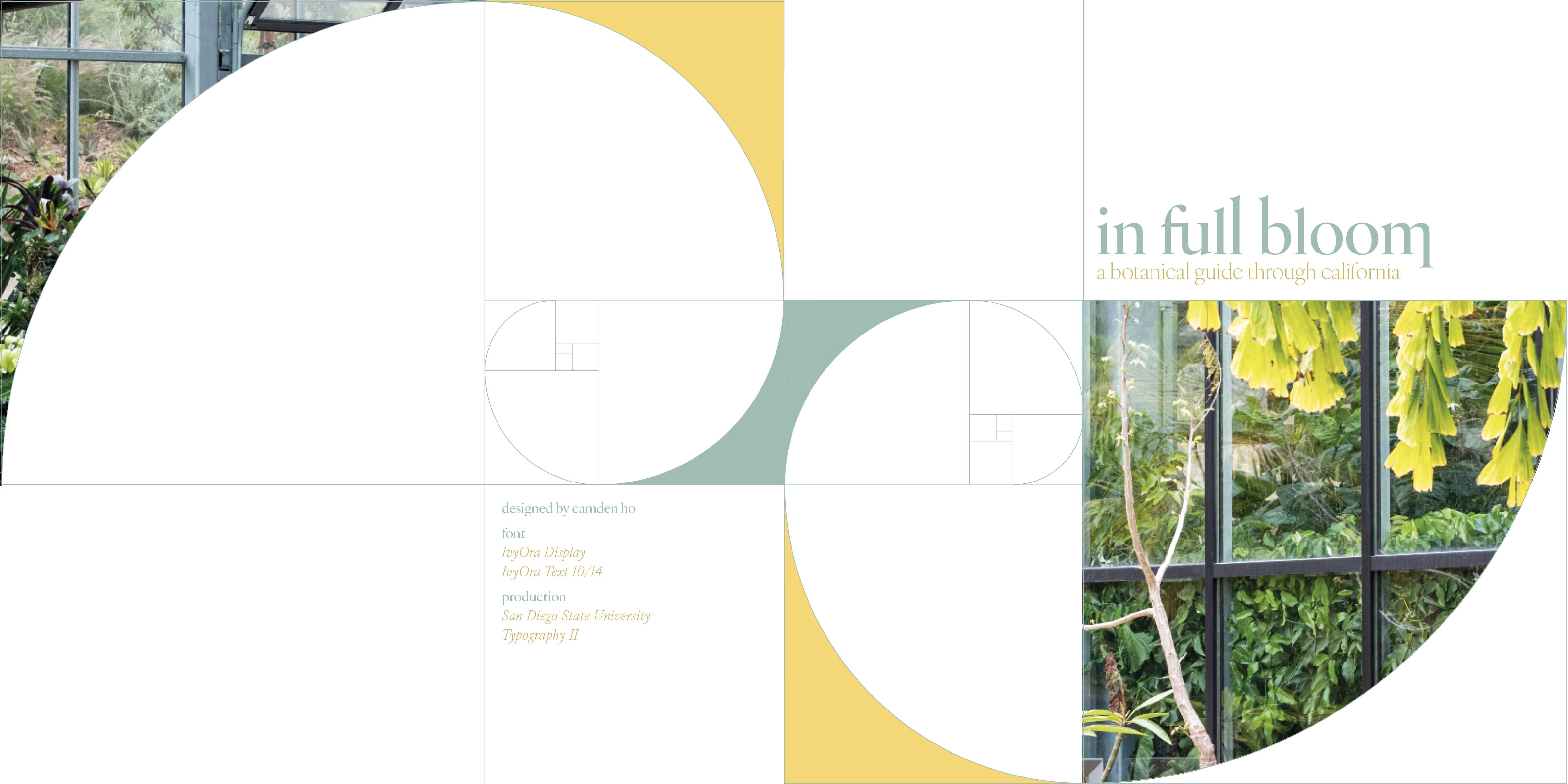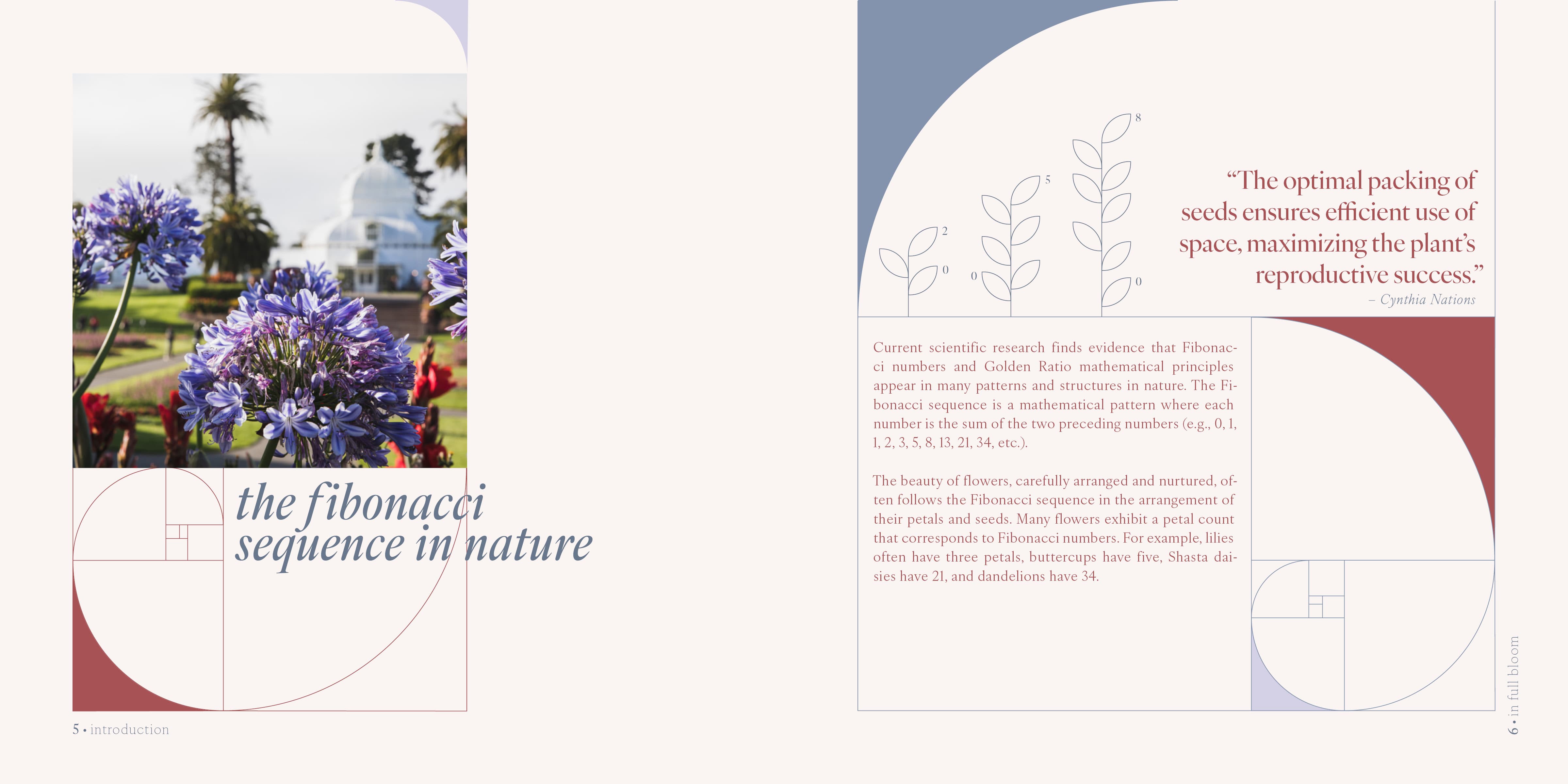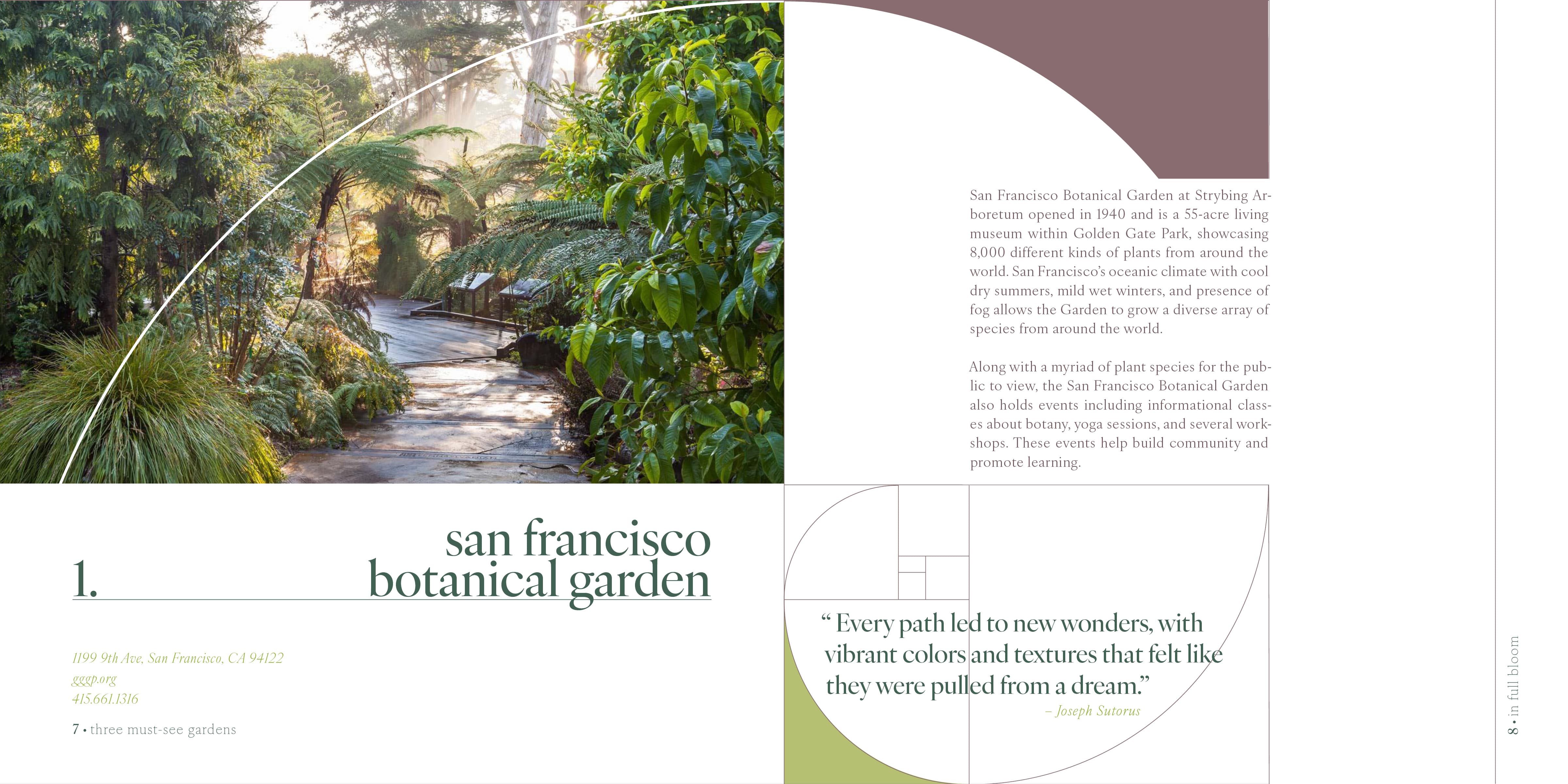 This project aimed to create an informational guide on our topic of choice. In Full Bloom is a guide that helps nature enthusiasts navigate the top botanical gardens in California. The content of the guide emphasizes the Fibonacci Sequence and its presence in nature, while the layout of the booklet follows the principles of the golden ratio. The golden ratio is consistently used as a design motif and grid. These considerations result in visual harmony and an engaging learning experience.