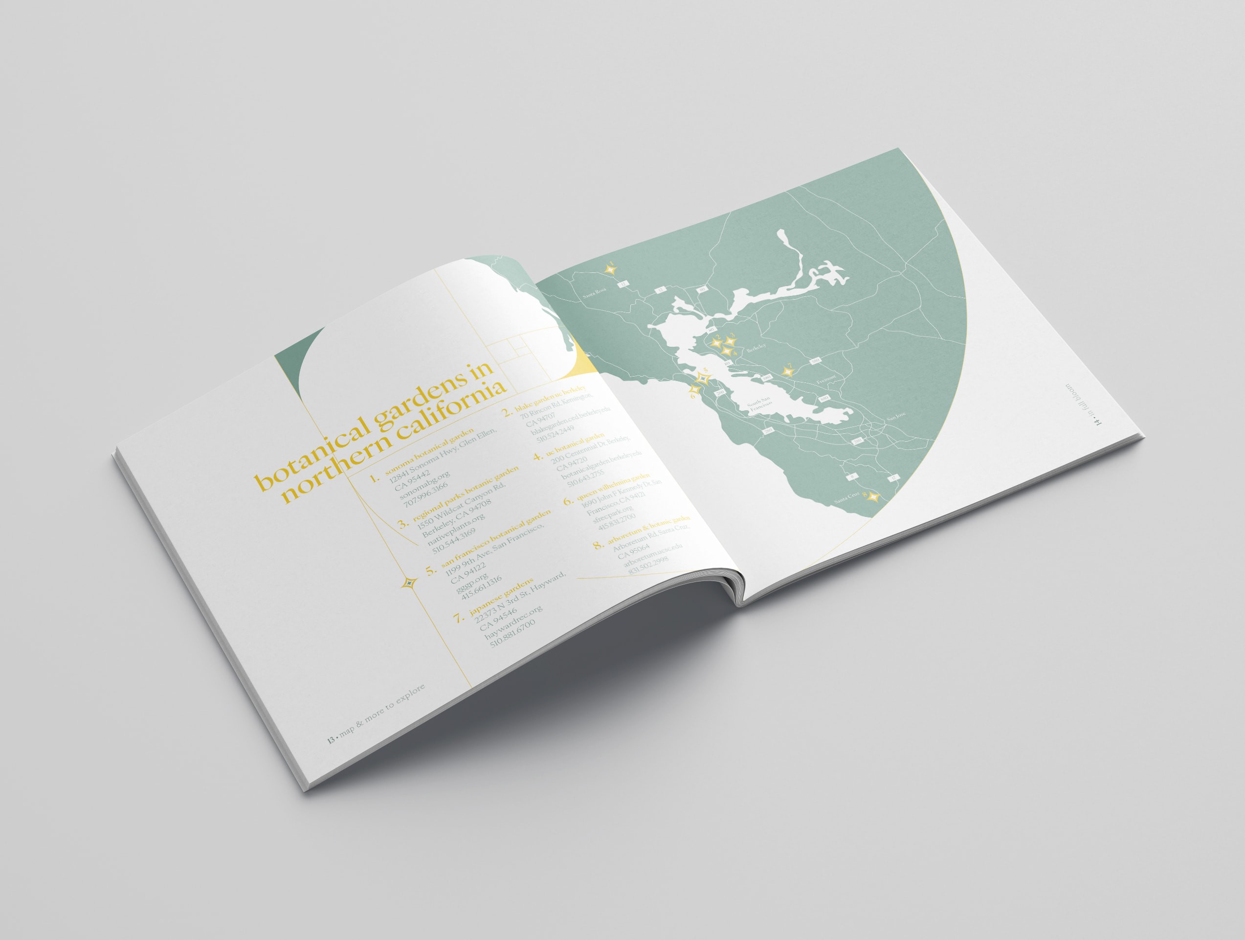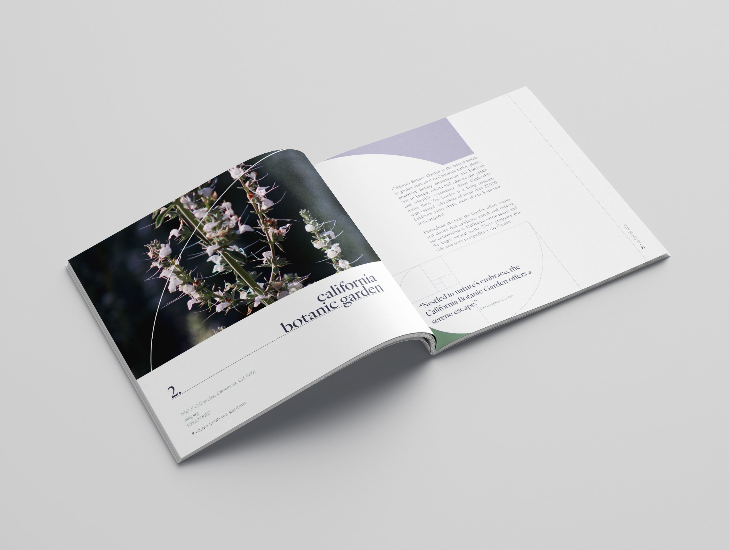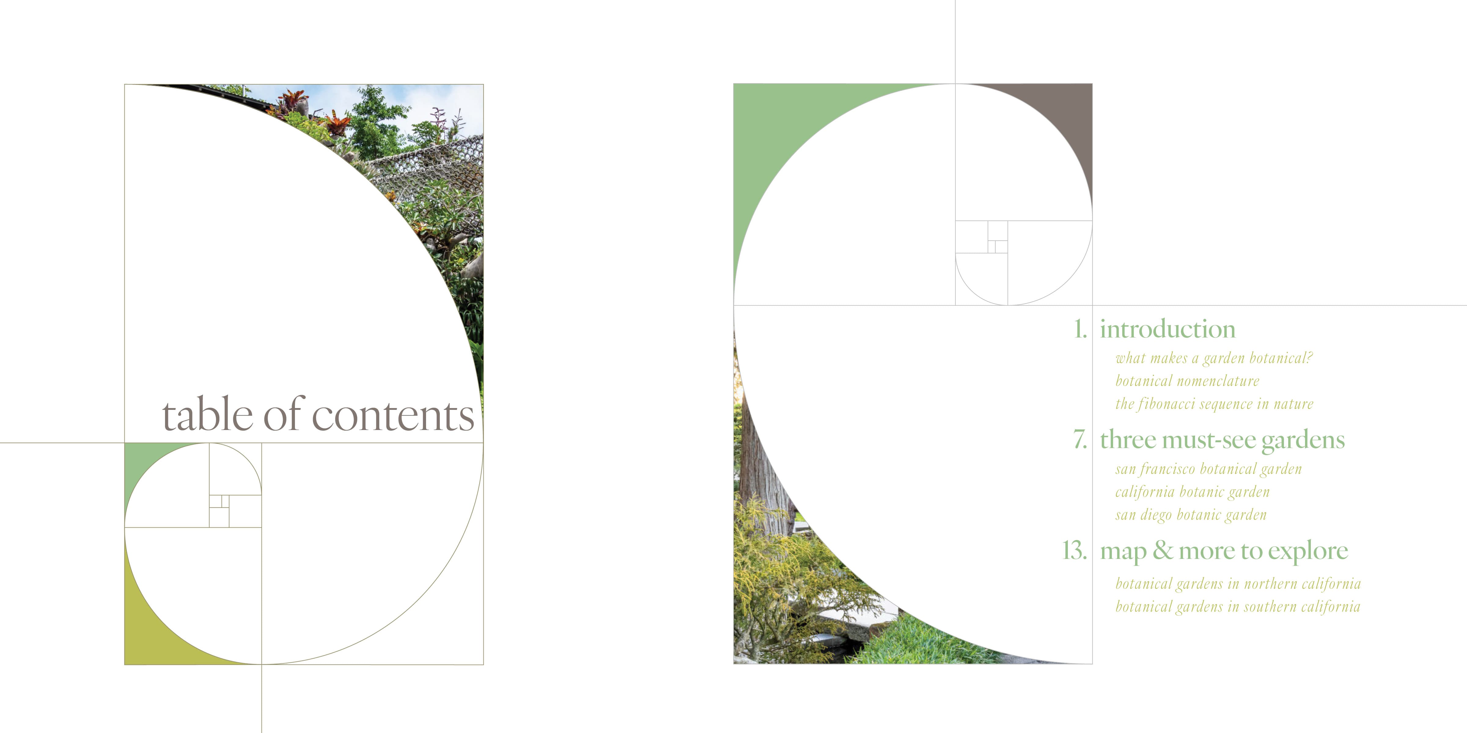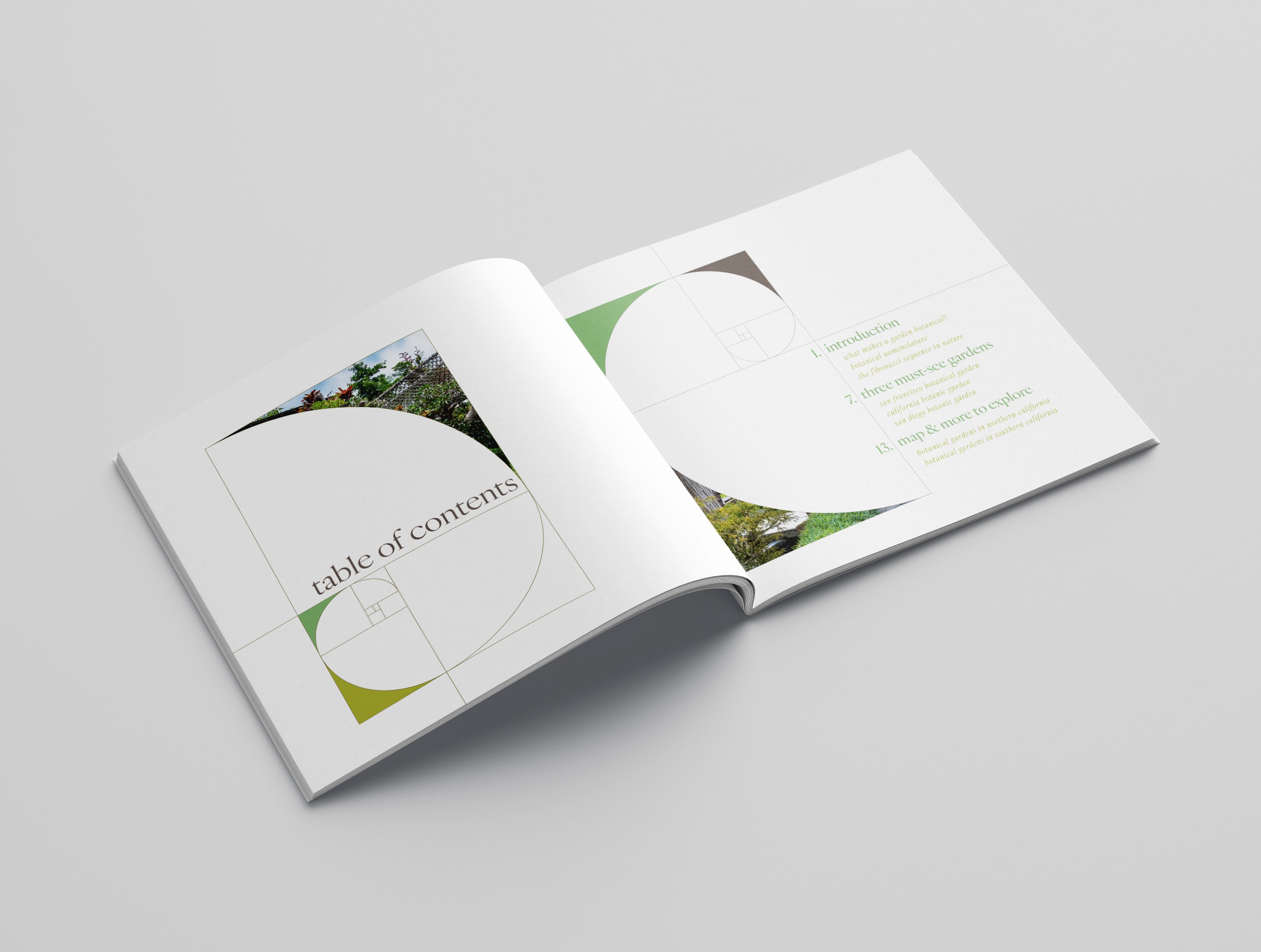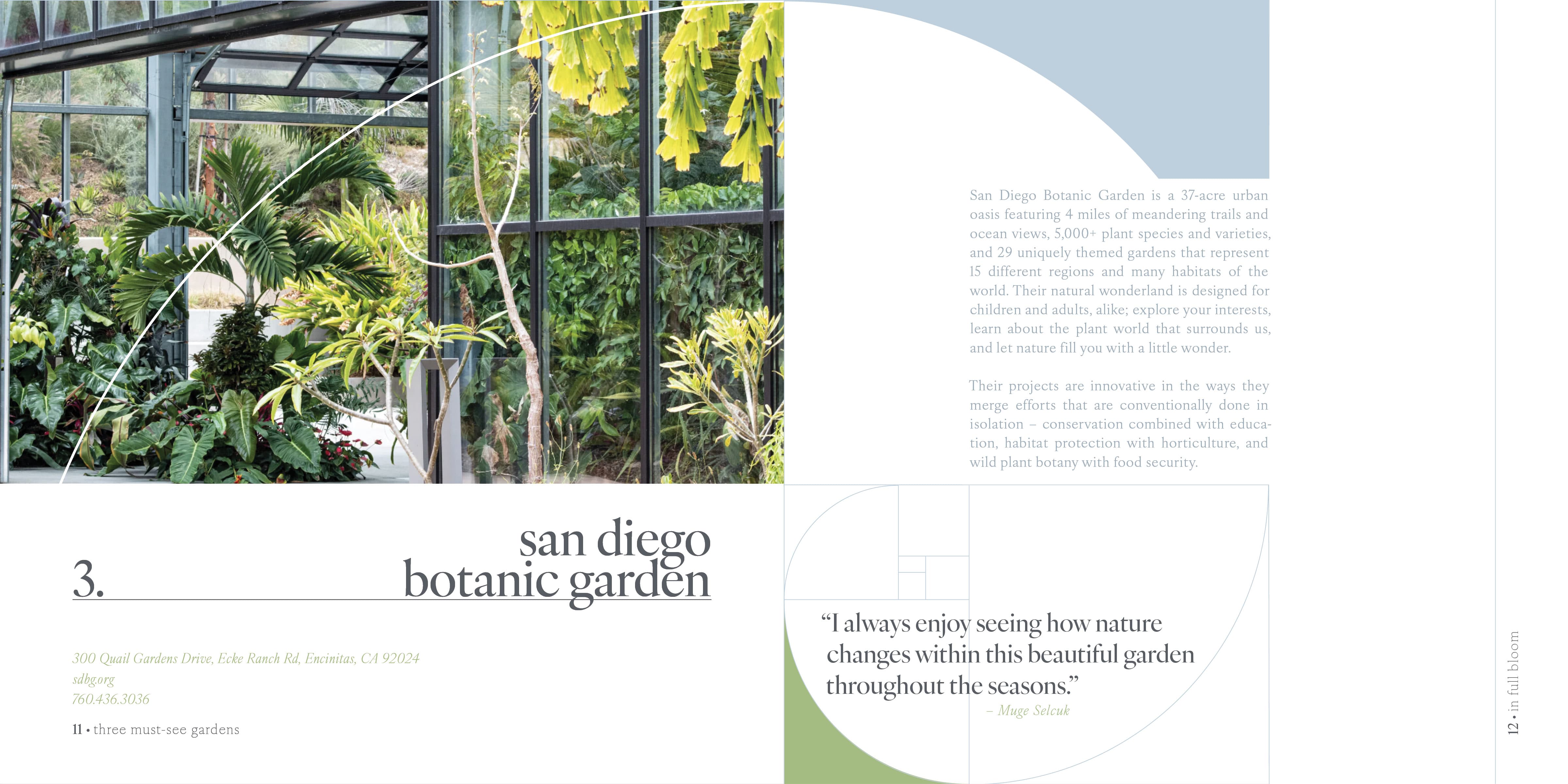 This project aimed to create an informational guide on our topic of choice. In Full Bloom is a guide that helps nature enthusiasts navigate the top botanical gardens in California. The content of the guide emphasizes the Fibonacci Sequence and its presence in nature, while the layout of the booklet follows the principles of the golden ratio. The golden ratio is consistently used as a design motif and grid. These considerations result in visual harmony and an engaging learning experience.