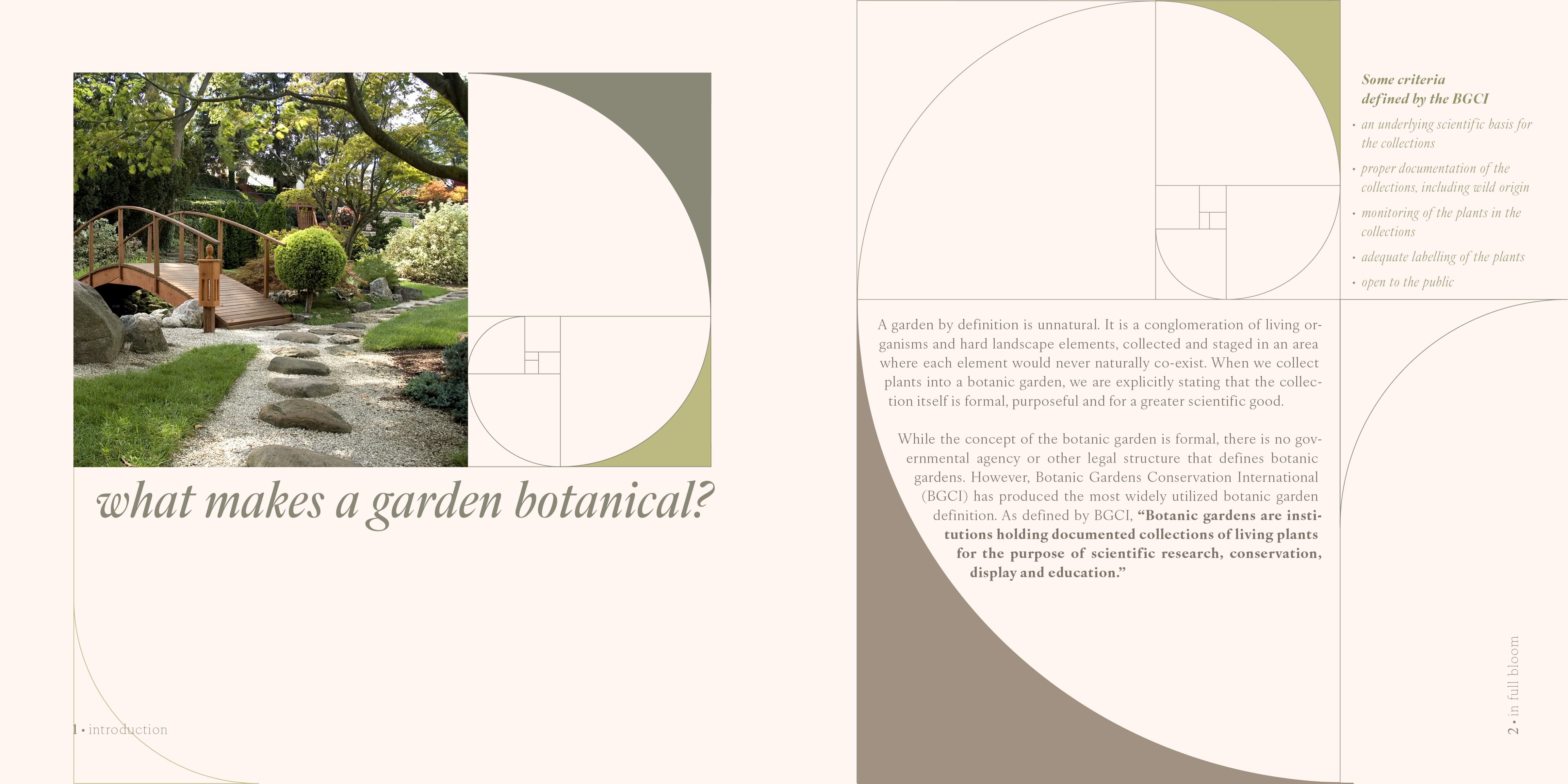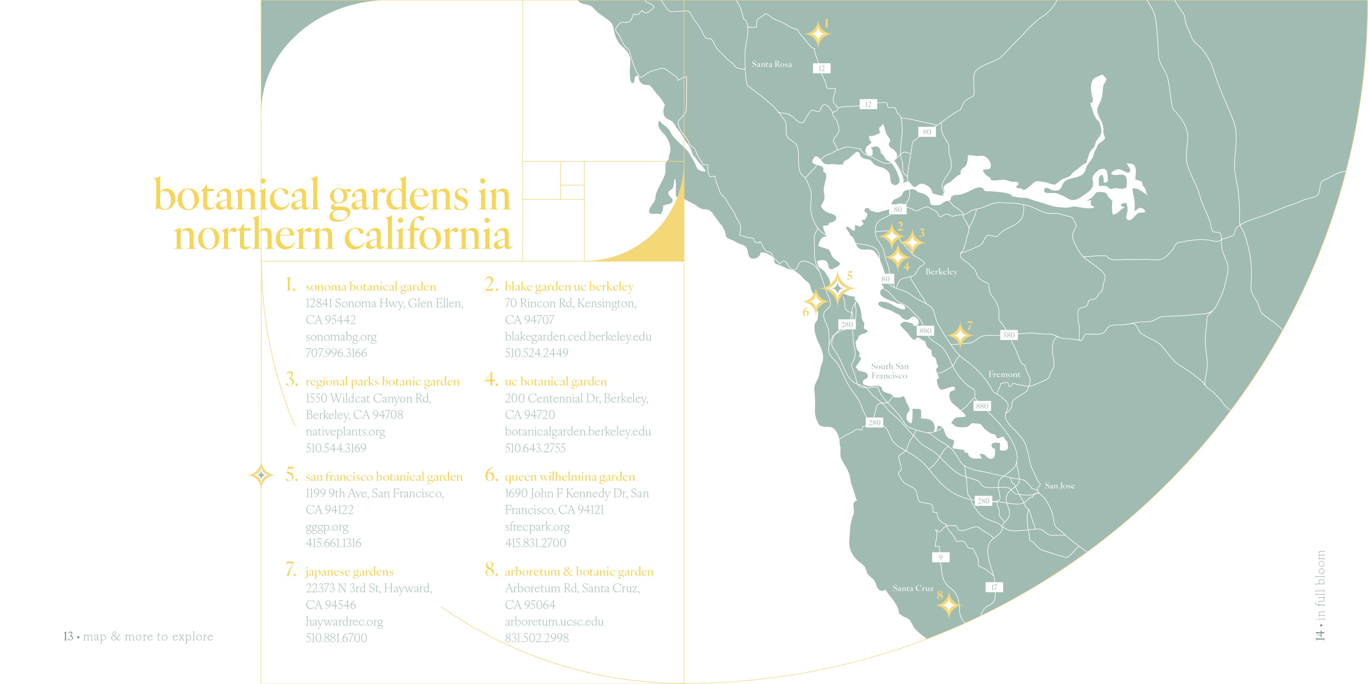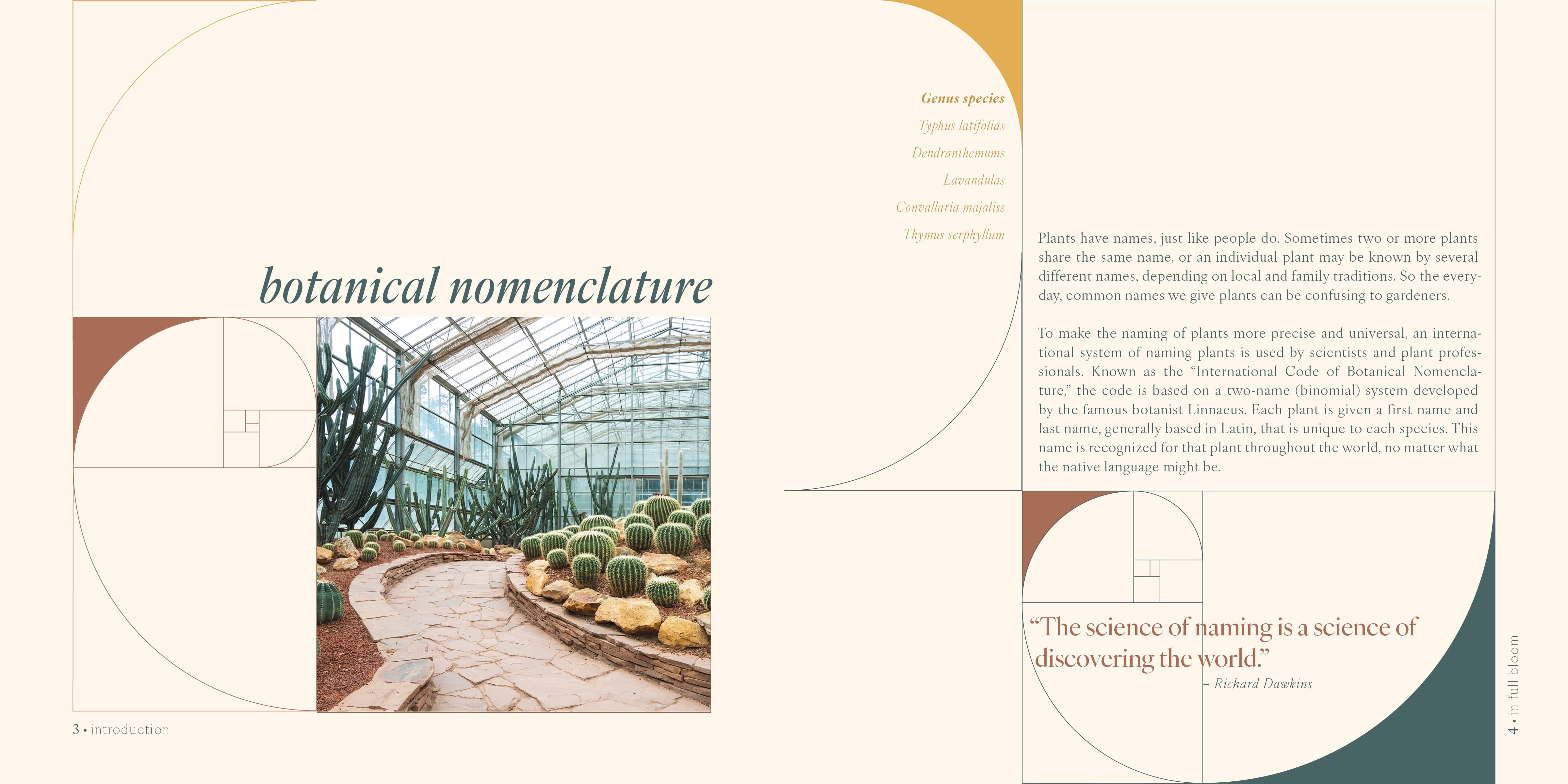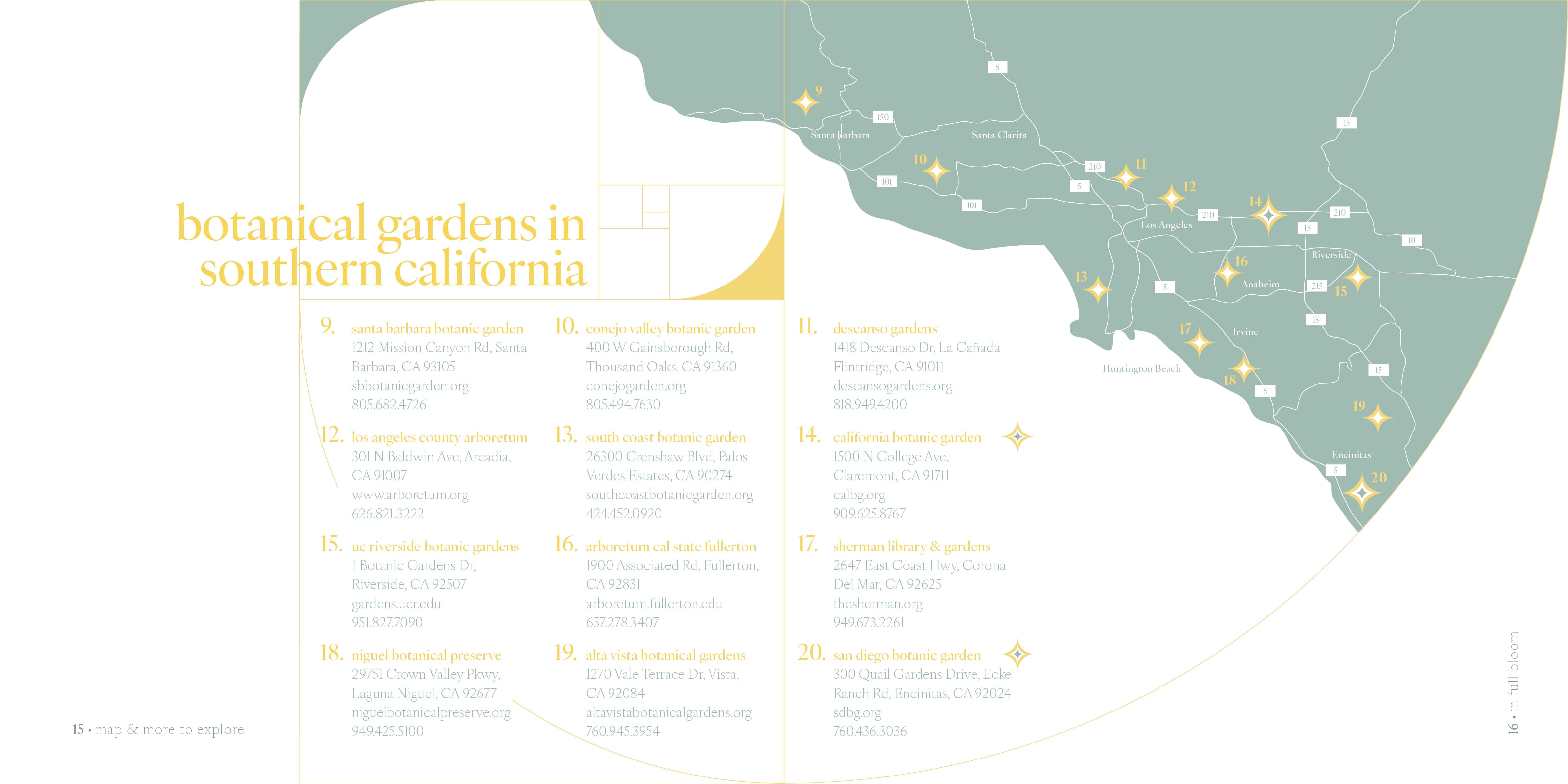 This project aimed to create an informational guide on our topic of choice. In Full Bloom is a guide that helps nature enthusiasts navigate the top botanical gardens in California. The content of the guide emphasizes the Fibonacci Sequence and its presence in nature, while the layout of the booklet follows the principles of the golden ratio. The golden ratio is consistently used as a design motif and grid. These considerations result in visual harmony and an engaging learning experience.