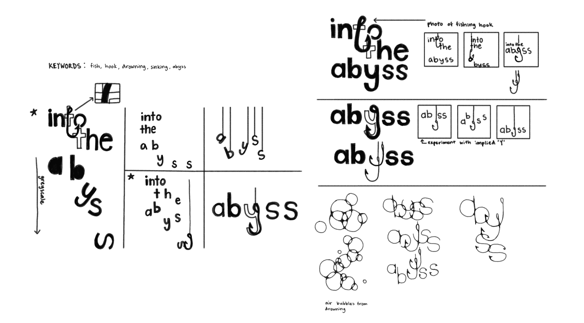 I chose to emphasize the phrase "into the abyss" from the lyrics to create the main logotype for the design. I experimented with the type interacting with the image and creating an implied fishing line by extending the ascenders and descenders of the letters. The fish are wooden figures that I scanned into the computer and edited in Photoshop.