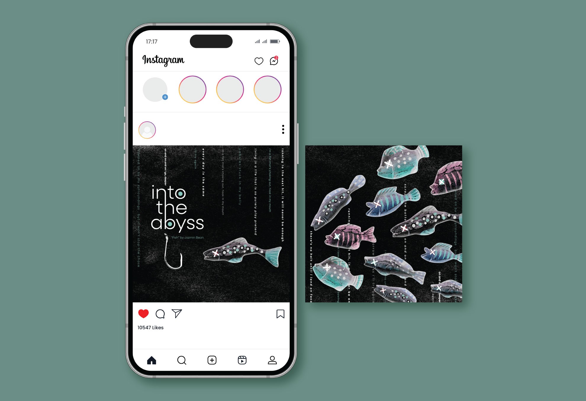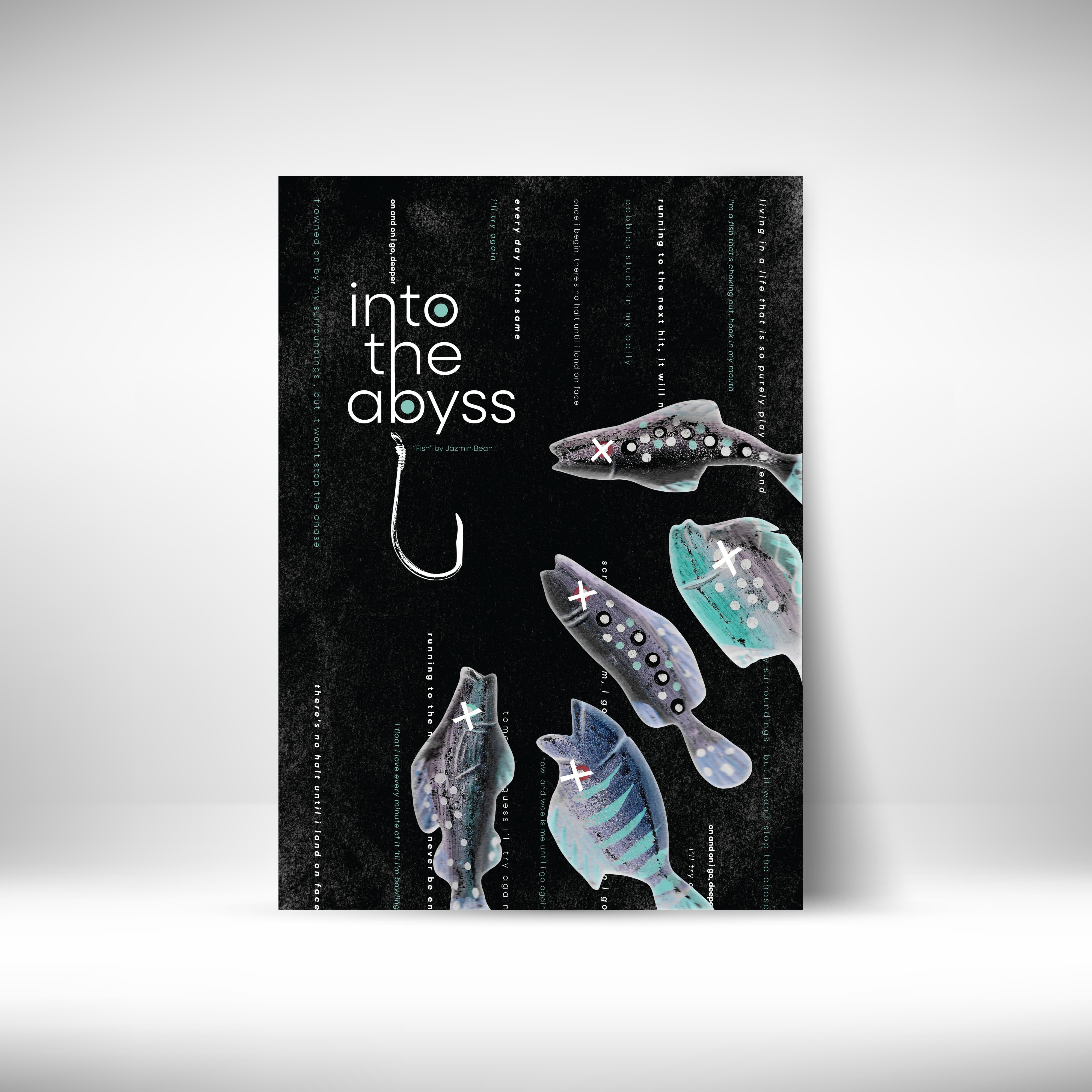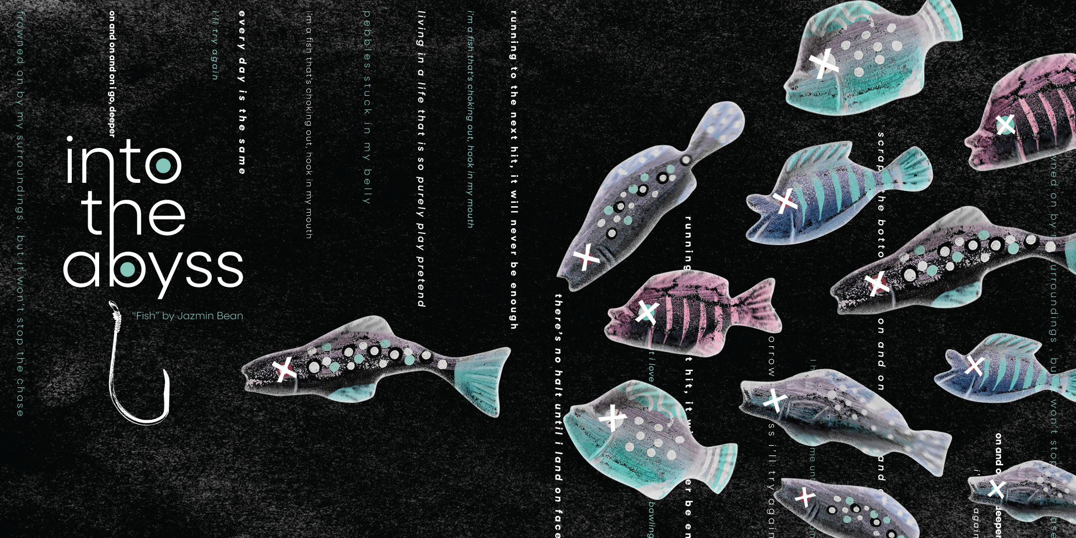 The goal of this project was to explore how typography and imagery can enhance a song's meaning, allowing the viewer to engage with the deeper semantics of the lyrics. Along with a poster, the design was rescaled to fit a square Instagram post. I chose the song "Fish" by Jazmin Bean, which addresses themes of addiction, indulgence, and a monotonous lifestyle. In the song, the artist compares themselves to a fish caught on a hook, sinking deeper into the abyss.