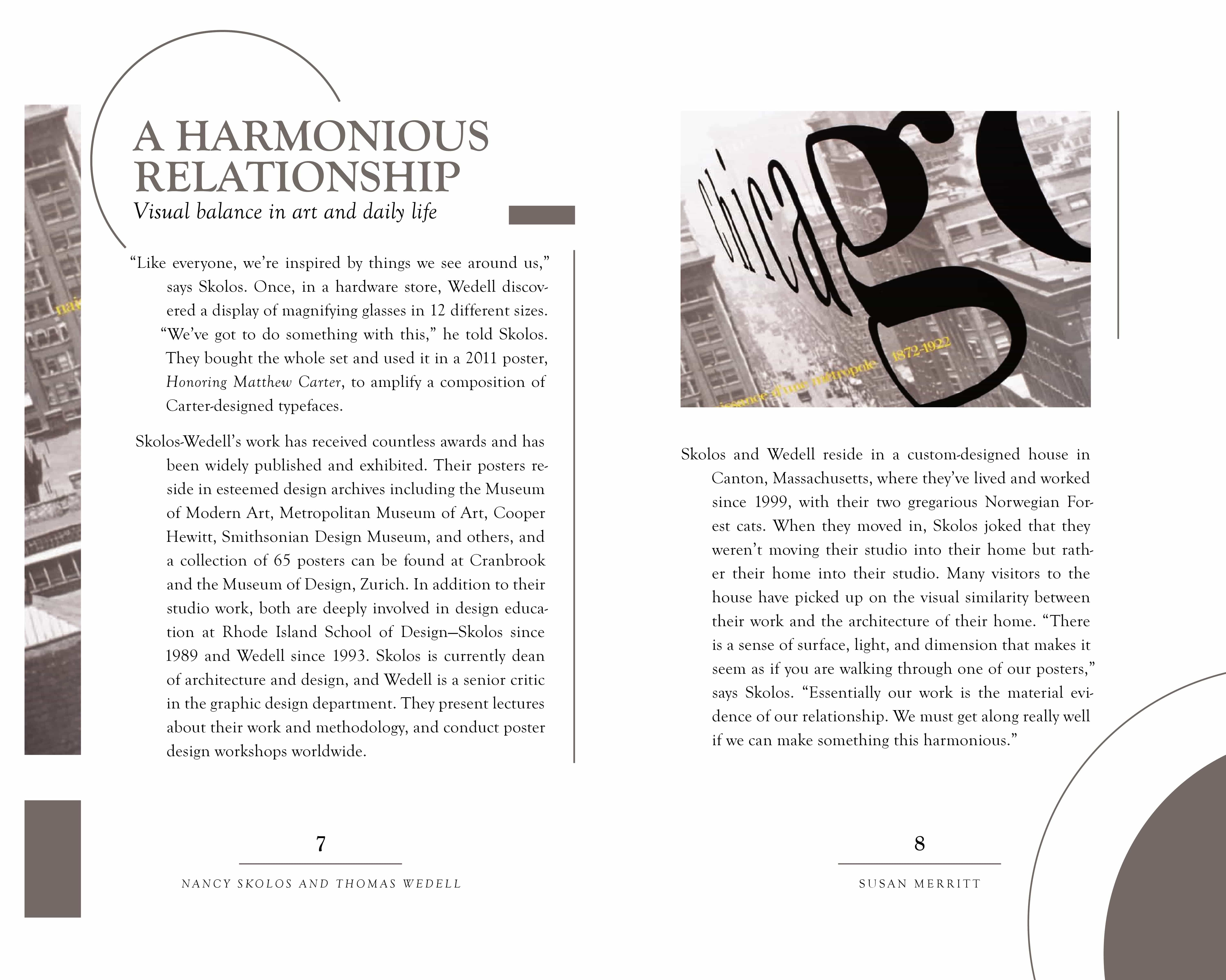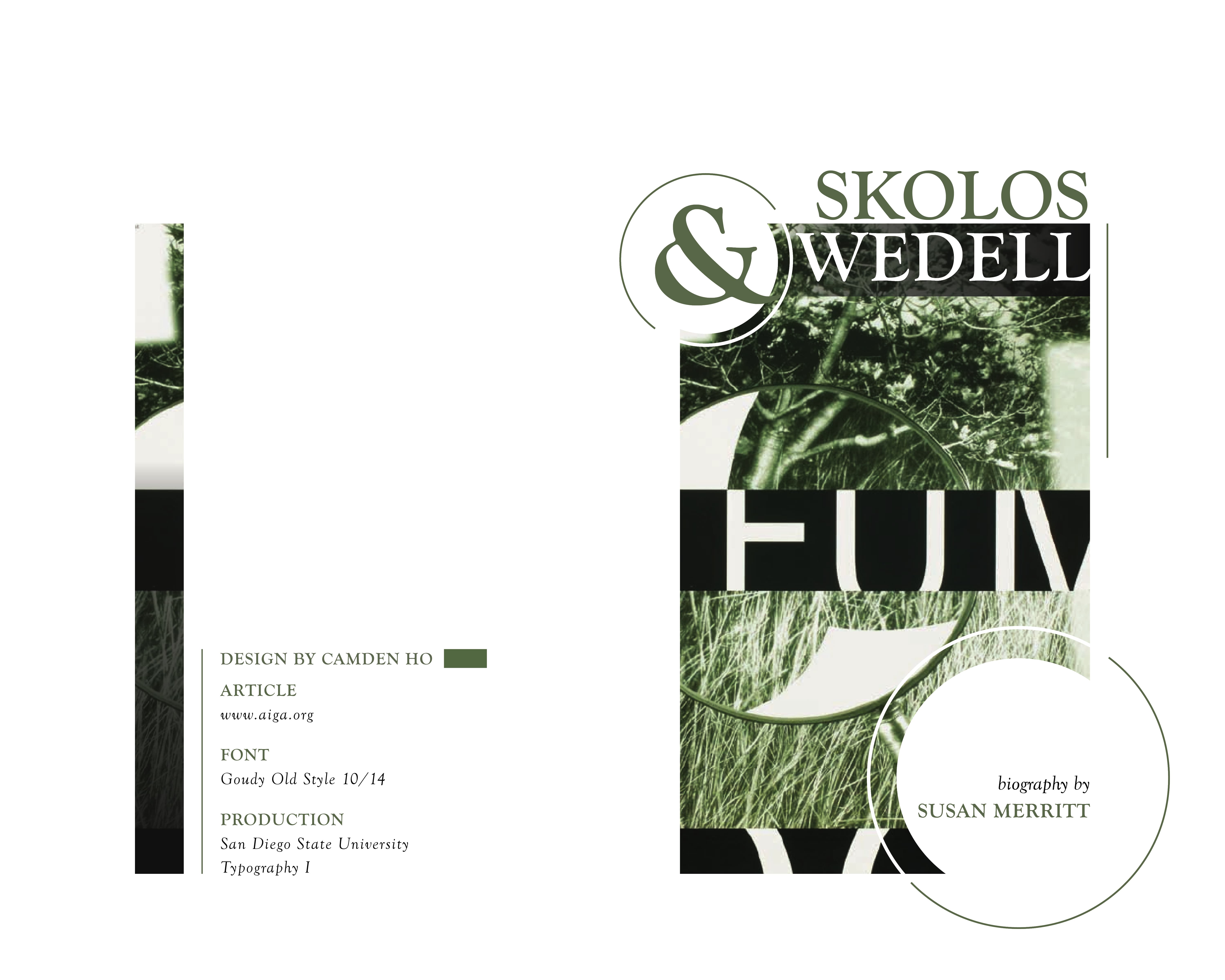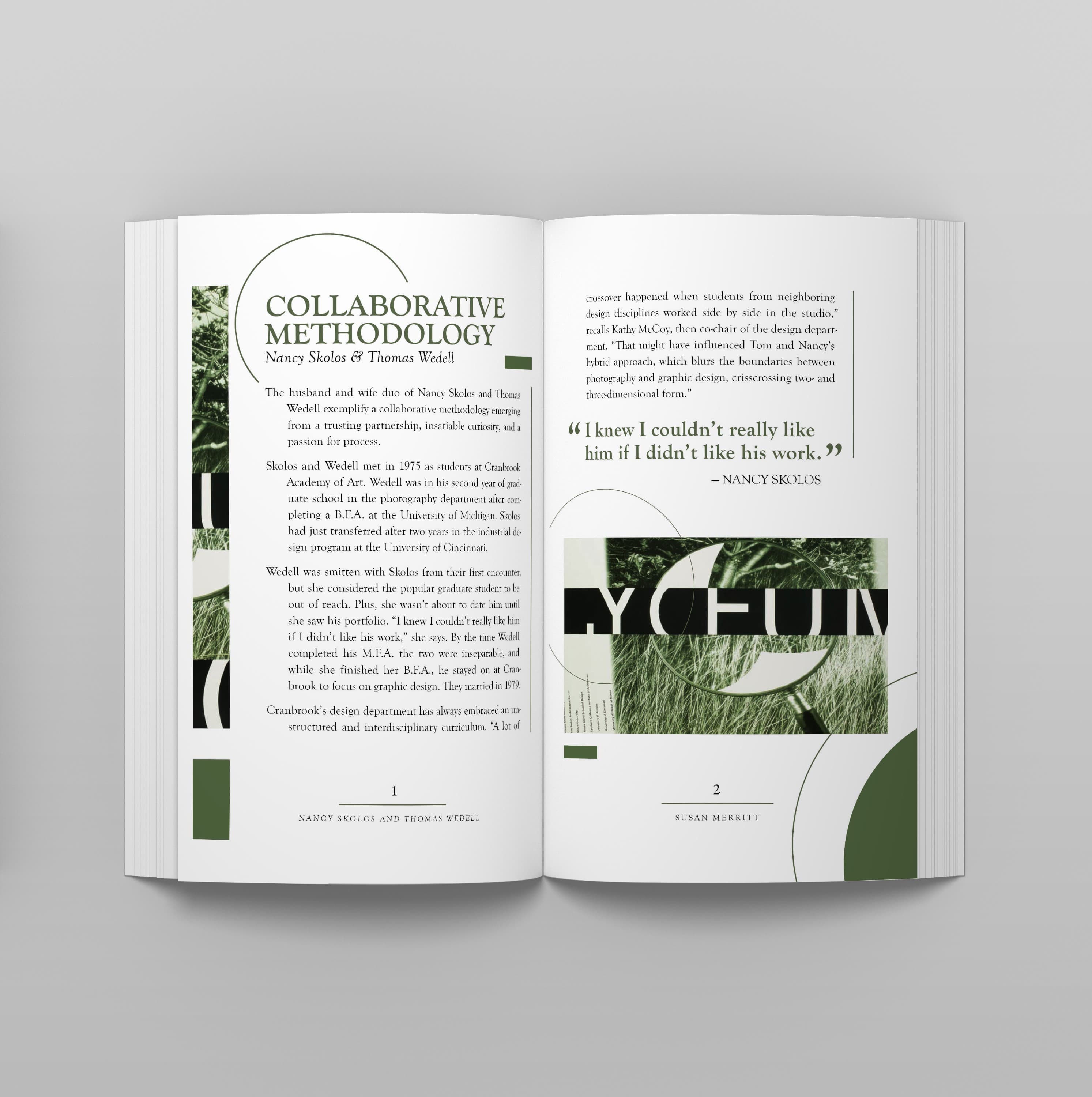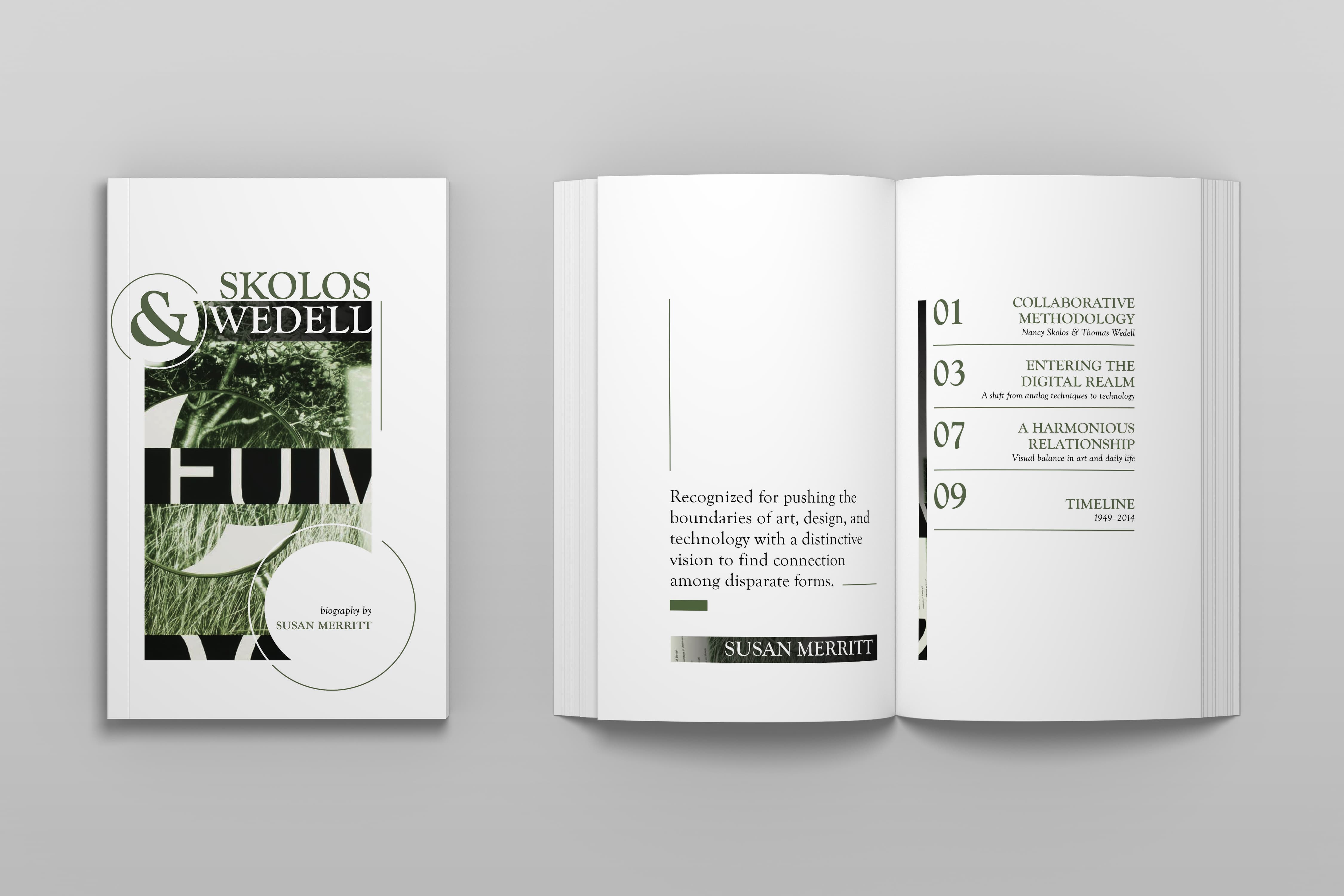 The purpose of this project was to apply the fundamentals of typography to a short, multi-page book. The book’s content, written by Susan Merritt, details the lives of the married couple and AIGA finalists Nancy Skolos and Thomas Wedell. The images featured in the spreads are designs by Skolos and Wedell. A cohesive design system was used throughout the book to ensure consistency and smooth navigation.