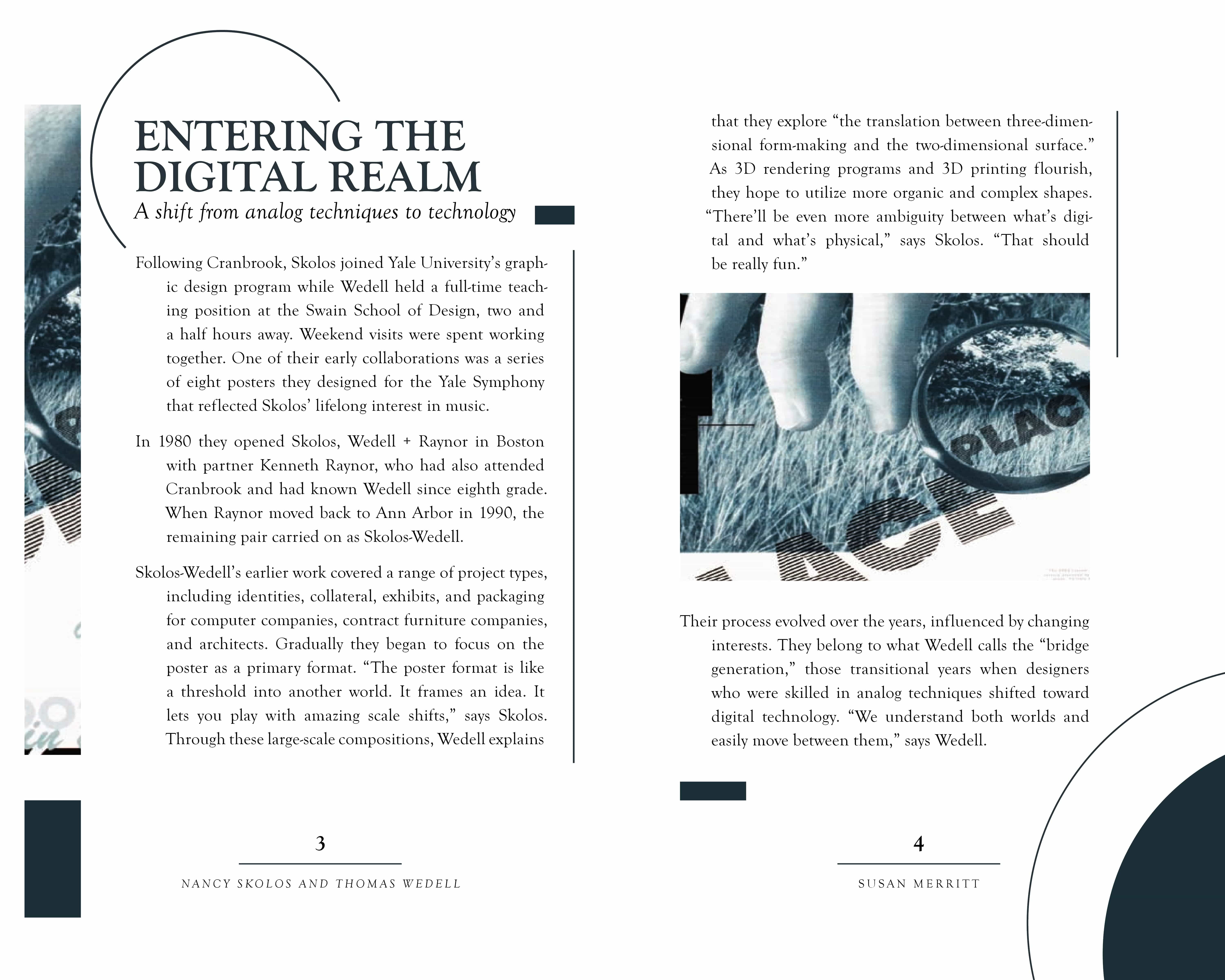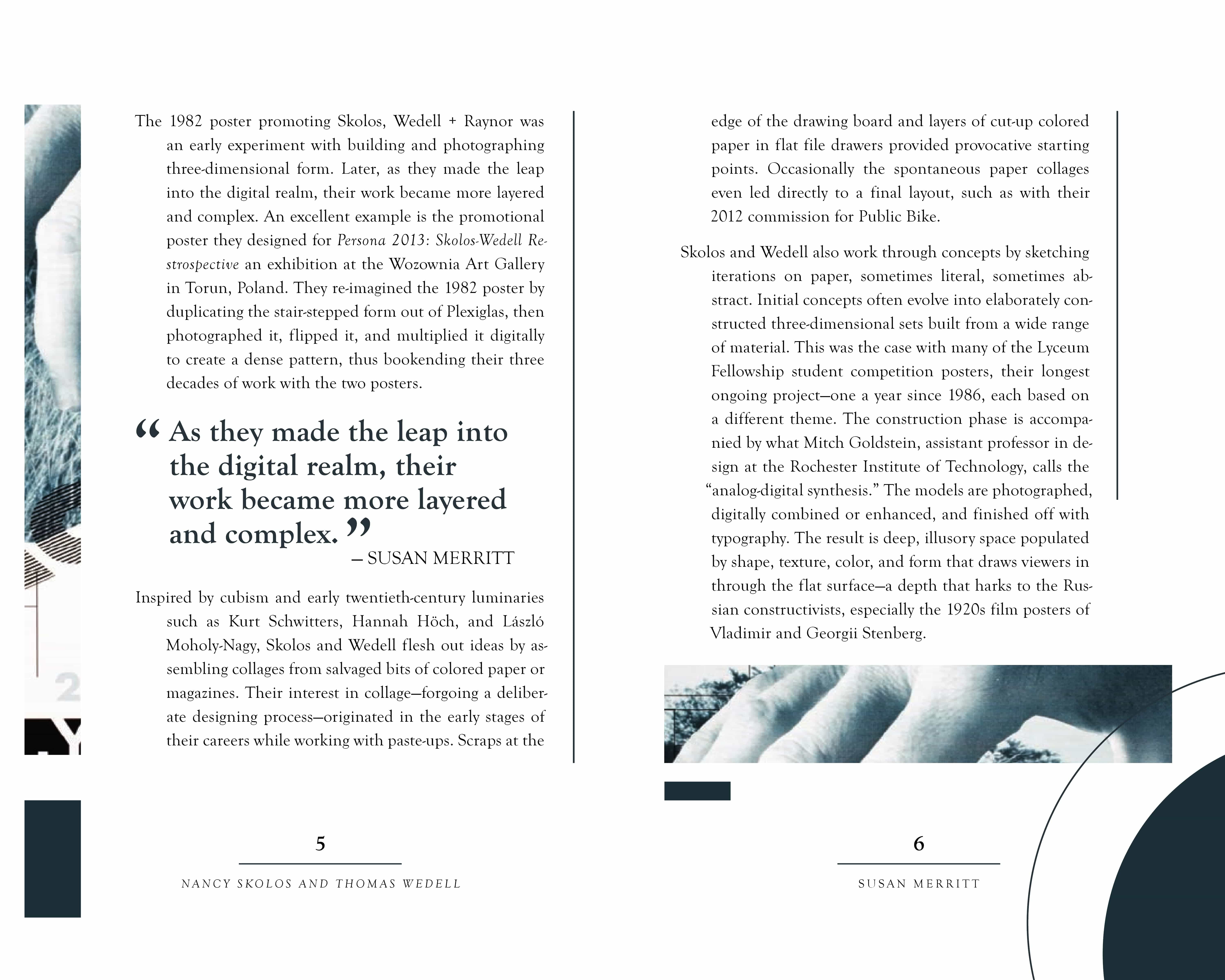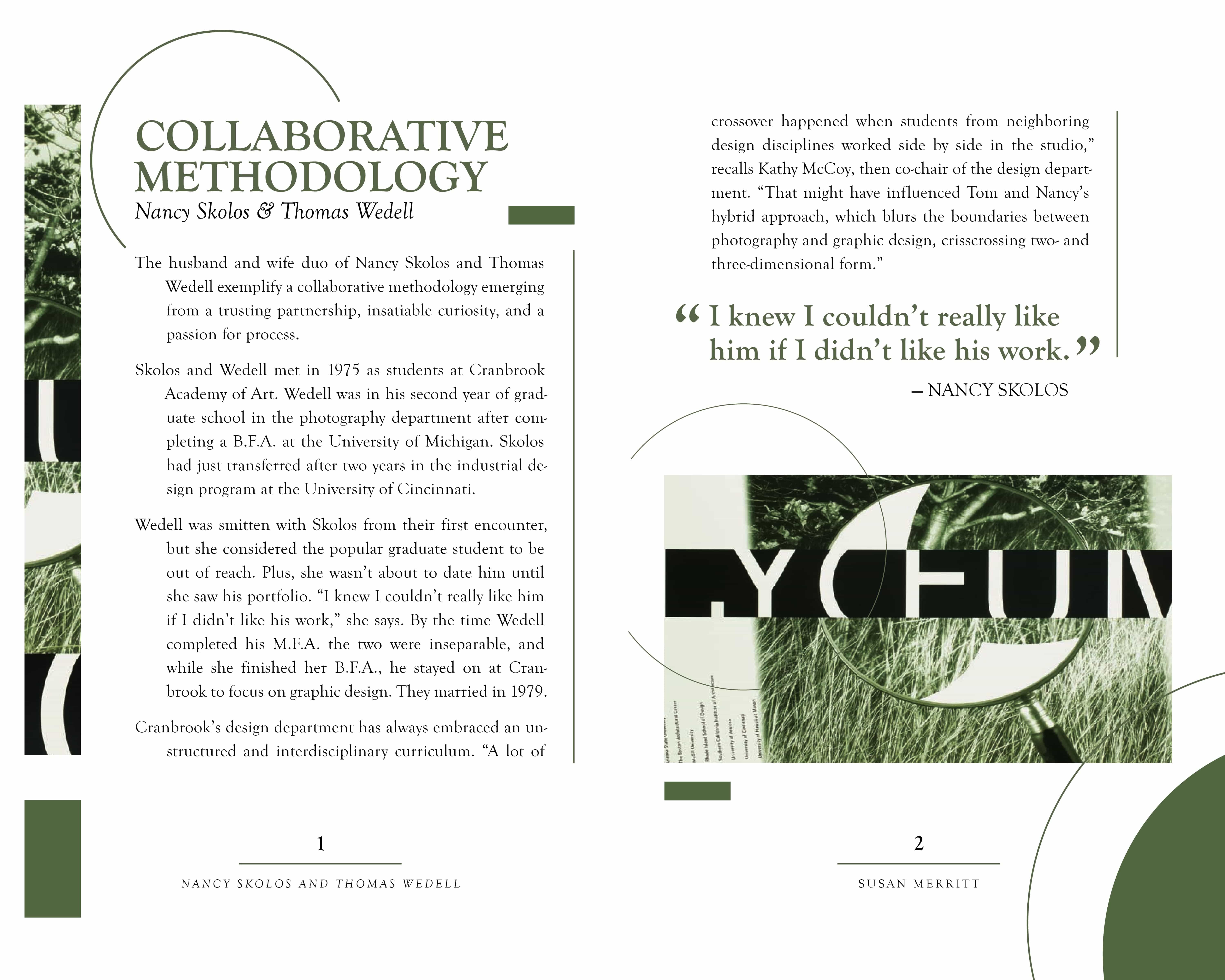 The purpose of this project was to apply the fundamentals of typography to a short, multi-page book. The book’s content, written by Susan Merritt, details the lives of the married couple and AIGA finalists Nancy Skolos and Thomas Wedell. The images featured in the spreads are designs by Skolos and Wedell. A cohesive design system was used throughout the book to ensure consistency and smooth navigation.